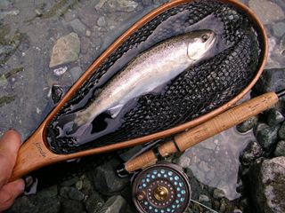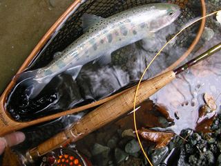 しくなったり弱まったりを繰り返し、大雨・洪水警報が出されていました。 今朝の渓流は、1~2㎝多い程度まで減水してい て、ささ濁り。渓流のあちこちに増水跡が残っていて、丘や川岸は崩された所があり、 川底は削り取られて平らではなくなったり、流されてきた砂が堆積したりしている場所がありますが、渓 相は原形を保っていて釣りはできます。今朝 は、水量が数㎝増えていて流れが速く、勢いがありますが、流れは徐々に落ち着いてきています。 日中は晴れて、朝方はまだ荒れた後が残っていた流水は、 順調に落ち着いていき、午後には徒渉しやすい速さに戻り、夕方には澄みました。今日は、速流で濁り が残る状況ながら、育ち盛り サイズ(20㎝~)のレインボーは数釣り。ウェット系が有効だったと伺う。ご来場いた だきまして、誠にありがとうございます。 夕方には、ほぼ元の水量に 近づきました。徒渉の際には、川底が削り取られている部分が箇所箇所あるため、一部に膝までの深さの所 があります。明日の朝までには、もう少し減水しているかもしれませんが、ニーブーツの場合はできるだけ 丈が長いものが適しています。 |