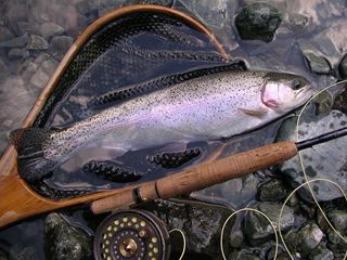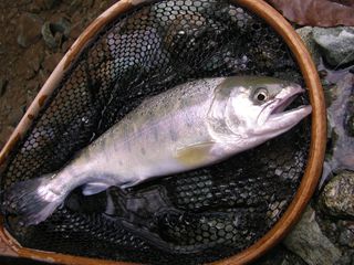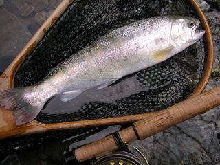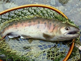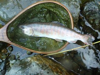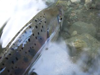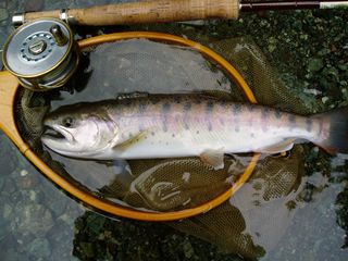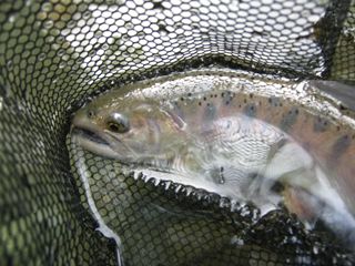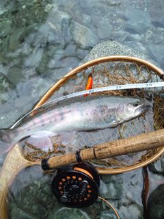 はポイントの形状から言って、多数の魚が棲みつける場所ではなく、大イワナや大レインボーが主になって居着いているのですが、そこでも限られたチャンスを