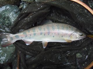 白泡の中からひっぱり出していただくと尺上の良形・美イワナと伺う。また、レインボーは各ポイントで活動的。時間帯も場所も選ばず数釣りの様子。本日は、