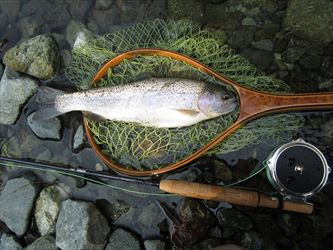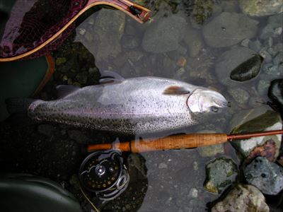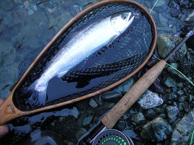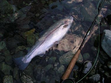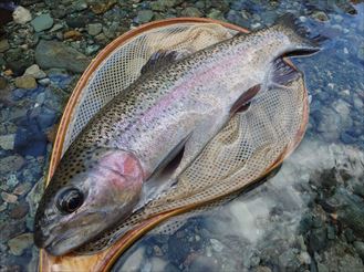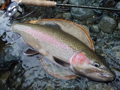 | <2015年8月8日> 大型レインボー(45~47㎝) / #12 アント系 大田区 石川さま *上流域の流心ポイントで成果。午前8時過ぎ。10分以上かかって手元へ。 情報のご提供とお写真の掲載にご協力いただきまして誠にありがとうございます。 |