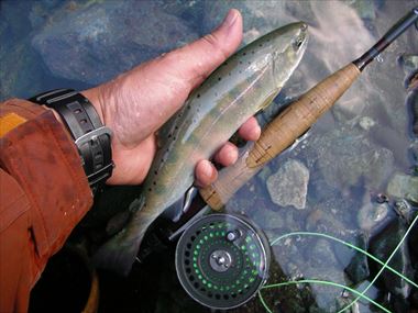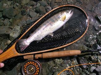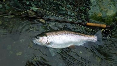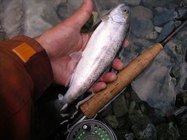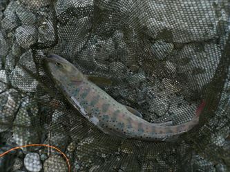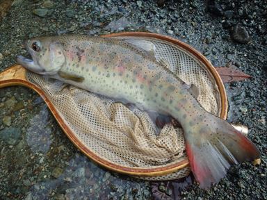 場所:受付正面やや上流の瀬,7:00過ぎ ↑ 成果のフライ 状況:姿を見せて反応良好。投げるといきなりキャッチ。頭全部水面に出すバイト 落 ち込みの肩から飛び出したヤマメ #16 ハンギングパラシュート 瀬に沈む石の裏に、ウィングケースが黒くなったニンフ(ヒラタカゲロウ類)が多 フライサイズを合わせて、水面を狙う。落ち込みの肩を流すと2~3投目に成果 時間/10:30 日中、日が高くなっても、水量の多い所に陣取っている魚は元気 ![]() 大レインボー 尺ヤマメ / ミッジ 場所:白泡の際,対岸の深みなど。 時間: 10~11時頃 情報のご提供とお写真の掲載にご協力いただきまして誠にありがとうございます。 |