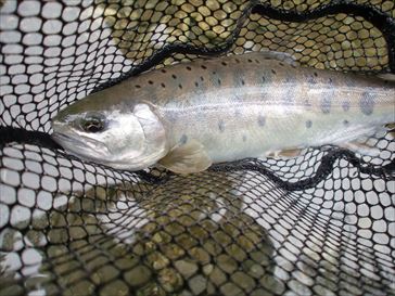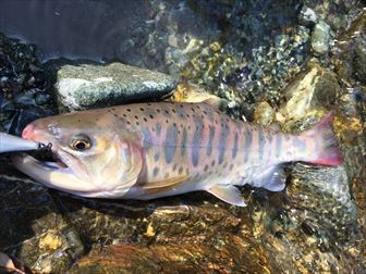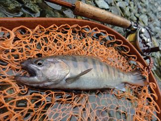 | <2015年8月11日> ヤマメ(3年もの) / ルアー:ミノー系 名古屋 Hiroさま ← 拡大情報のご提供とお写真の掲載にご協力いただきまして誠にありがとうございます。 |