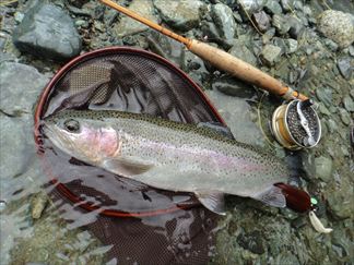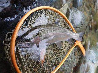 | <2015年1月2日> 48㎝レインボー(#16ニンフ:ビーズヘッド) 目黒区 DANNAさま 拡大・活性は、10:00~14:00が良好。(14:00以降は、急に活性がおちた印象) ・成果は、巨大レインボーを含む数釣り32尾。 ・ニンフは、#16・18 ビーズヘッド各種。 ・ドライは、#18~22 ミッジ コカゲロウのスペントパターン。14:00前後に成果。 情報のご提供とお写真の掲載にご協力いただきまして誠にありがとうございます。 |