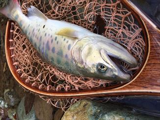 | <2015年8月22日> ヤマメ / #14 ニンフ系 茅ヶ崎市 佐藤さま 晴天の日中、ヤマメは速い流れの中にいて、表層までは浮上せず、少し下に。 対策:#14 ニンフ系で、アクションをつけて、アピールしながら引いてくると成果。 情報のご提供とお写真の掲載にご協力いただきまして誠にありがとうございます。 |