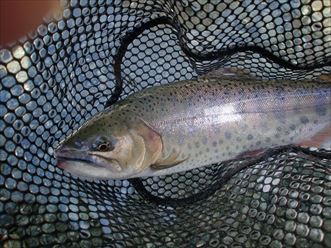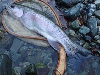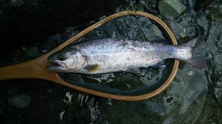 | 天気は、曇りのち雨。本日は、やや冷え込んでいた朝(-1℃)から、あまり気温が上がらず(日中は3~5℃)、水温も9℃止まりで、昼間も外気がひんやりとしていました。午前中は、風がなかったため、気温の低さのわりには、体感的には震えるような寒さは感じなかったものの、ハッチはなく、魚は全体的に低層にいて、昼頃にはサクラマスなどが、やや高めに着いて、もじったり控えめなライズをしていたりしましたが、ライズが小さすぎて、タイミングが合いにくかったご様子。レインボーは、各所で川底にべったりと沈んでいて、昼には、冷たい雨が降ってきて、さらに外気はひえてきて、魚の動きは少なくなったようでした。午後の雨は本降りになり、夕方には、少々濁りが入り、少しずつ増水してきました。雨が止むのは、明日の明け方の予報ですので、以後の状況は明朝お知らせいたします。 *雨が止んだ後、深夜~翌朝に冷え込んだ場合は、(路面がぬれているため)路面凍結の恐れがありますので、県道710号は、気温が上がってから(午前9時以降)走行されることをおすすめします。最もカーブが深い所や、橋(谷戸口橋)の上は、すべりやすいので、お気をつけください。 |