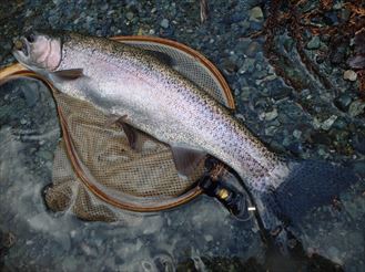 | 天気は晴れて、昼頃までは時々風あり。今朝は、強めの冷え込みで-4℃。霜や水たまり、屋外水道が凍る寒さでした。太陽は、時間通りに順番に(午前8時半頃~午後2時頃まで)照り、日向の気温・水温は何とか上昇しましたが、昼の最高気温は7℃弱。水温は10℃。午前午後とも、ほぼ5℃前後で落ち着く、肌寒い一日でした。ハッチは昼過ぎに増えて、ブユの群れにカゲロウやトビケラがチラホラ。風が出るといなくなり、止むと現れる状況でした。冬本番の陽気だった本日のところは、ライズポイント(ほぼ毎日、ライズの捕食態勢をとる場所)でも、ライズタイムは短く、(ライズの)回数も少なく、かかりも弱い状態だったようで、ドライは、限られたチャンスをものにしていただいて、成果のご様子。全体的には、活性が低い状況が多い中、突発的な活気に合わせて、チャレンジしていただく釣りだったようで、厳しい条件で成果の魚は、年越しサクラマスや、居着きのレインボーなど、良型でパワーのある魚だったようでした。 |