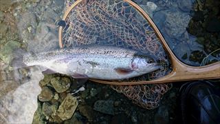 | 天気は晴れて、風あり。今朝は冷え込まず(気温3℃,水温10℃強)、朝一(午前8時半頃)から太陽が照り、日向になった所から順番に気温が上昇して、午前11時前に気温は10℃、水温は11℃、昼の気温は15℃、水温は12℃になりました。今日の陽気は、陽射しが暖かく、気温が高かった反面、午前中から風が出てきて、時々強め。吹く風はつめたく、日陰では昼間でも肌寒かったのが特徴的。日中に、つめたい風が強まったことで、今日のハッチは風の止み間に増えて、吹くと散らばって、姿が見えなくなることもたびたび。気温が高いわりに、体感的には寒いという、アンバランスな陽気だった本日は、レインボーの活性にムラがあり。最下流では、珍しく、早朝(午前7時頃)から、姿を見せていたり、上流の平瀬では、午前9時前の陽が射し込んで間もない時間帯から、活気があり、大型レインボーがルアーで早々に成果をお見受けすることに。しかし、その後、風が出てくると、各所のレインボーたちは、活性が落ち着いてしまった傾向で、代わって、年越しヤマメやサクラマスたちが高活性に。風があり、ハッチは乱れがちでしたが、ヤマメやサクラマスは、浮上体勢を崩さず、昼を中心に、ずっと表層で活動していたとのことで、ルアーは各種有効。ミノー系は、変則的なアクションをつけられるタイプでも、サクラマスの成果。また、手持ちの中で、最も小さいスプーン(2g)を選んでは、スピード調整などで、年越しヤマメの成果、とヤマメ系の数釣りをお見受けする。午後になると、徐々に風が収まってきましたが、太陽が翳ってしまうと、外気はひんやりと冷えてきました。活性が高まっていたのは、今日もやはり昼頃が中心だったようです。 |