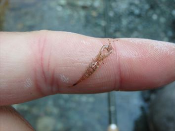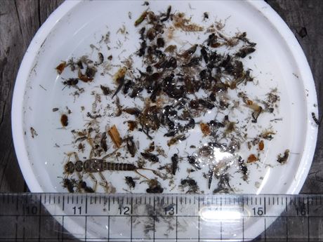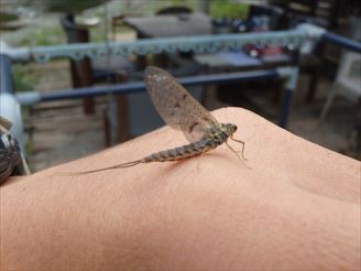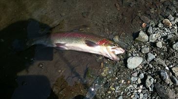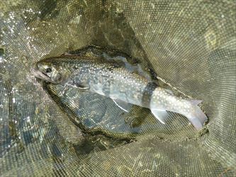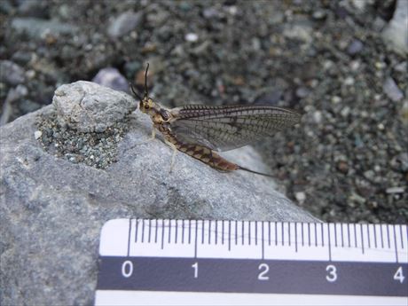 | 天気は晴れて、風が時々。今朝も、少し冷え込んでいて-1℃。霜が降りていましたが、凍ってはおらず。今日は、午前8時過ぎから太陽が照り、エリア内には、午後2時頃まで順番に日向ができていました。各ポイントの、日照時間やタイミングはそれぞれで、さらに日に日に、太陽の角度が変わっていくため、朝(午前9時前)のうちに30分程度、陽があたって、後の時間は日陰になる所や、昼までずっと日影で、午後に1時間位日向になる所だったり、一日のうちに(朝と午後など)何度か、比較的長く、陽があたっている所があったり・・・と様々。そこで、「いつ」「どこで」「なにで(大きさ・重さ・形状・色等)」挑戦するのか、タイミングが重要なようです。今日の場合は、ハッチは昼過ぎに多く、ブユの大群、ユスリカの他、午前10時頃には、羽化したばかりと思われる、中型カゲロウのダン(薄茶系・12~13㎜)が、足元の石の上にいて、昼過ぎには、各種の小型カゲロウや小型のトビケラなどが飛んでいましたが、午後に風が出てくると、散らばったようでした。本日のところは、全体的に低めの層で活動。大型レインボーの中にも、見える所に現れているものもいて、活動していましたが、川底付近の低い層に構えたままだった印象で、捕食対象は小さめ。#10~12を試してみると、避けていたとのことで、サイズは、#20・22でも、反応が少なかったとのお声。その一方で、居着きイワナの成果もあったと伺う。ルアーも、中には、追ってくる魚もいて、昼過ぎにはチャンスがあり、成果に至るも、午後には、さらに活性が低くなったようでした。 |
