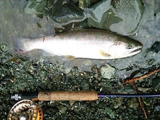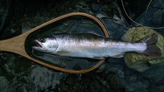 | 天気は、午前中が時々雨。昼は晴れて、午後は曇り時々晴れ。風は時々あり。昨日の降雨は、明け方に一度あがって、午前中は時々降るも、水量はそれ以上増えることはなく、3~5㎝多めを保っていました。水量が増えた分、流れは速まり、勢いも強まっていて、今日の魚は、低い層に入っているものが多く、早瀬の速流の中や、白泡が勢いよく注ぎ込む、巻き返しなどには、まだ着ける状況ではなかった様子でした。昨日から引き続いて、雨が降っていた(のちに晴れ間あり)今日は、気温の上下が少なく、通常よりも暖かめで、少々風が出ても、日中の気温は11℃(水温も11℃)。しかし、昼に風が吹いていたため、ハッチは一時的だったのが残念。カゲロウのスピナーなどが数匹飛んでいたり、カワゲラなども現れていましたが、午後には、あまり見られなくなっていました。水量が多めで、流れが速まり勢いが強まっていた本日は、ハッチが少なかったことや、流れてくるものがあったことなども加わって、魚の捕食タイミングがまばらで、難しい釣りに。それでも、ハッチがあった時にはライズし、流下物がある時には中層程度で、頭を左右に振りながら、流心をせり上がっていく、など、年越しのサクラマスは、場面場面で積極的な様子を見せており、晴れた昼頃(午前11時過ぎ頃)にはライズをとらえることに成功(ドライサイズ#20)されたケースも。全体的には、レインボーが、低い体勢しかとれずなかなか流れに出てこれなかったため、釣果は厳しかったようでした。 夕方になると、流れの勢いが、ようやく収まってきた印象で、流れ込みの白泡が、朝方よりも、きめ細かくなっていました。水量の方は、今日一日では、少々減水した程度と思われ、明日は元の水量に近づいてくる見込みです。 |