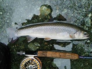 | 天気は、曇りのち晴れ。今朝は、冷え込まず(午前7時前にすでに4℃)、晴れてくるまでに、少々時間がかかっても、暖かい陽気でした。昼間の気温は~15℃。水温は~12℃強。ハッチは、昼前から大量で、ブユの大群、ユスリカ、コカゲロウ数種など、常連の水生昆虫の他、昼前後には各種のカワゲラが多数飛んでいる賑やかさで、中には、何度も水面を叩きに降りてくる成虫(カゲロウと思われる)の姿も。魚は、場所によって、活動的な時間帯が異なるものの、反応がわかりやすい層に現れている魚も多く、各所で活気立つタイミングあり。ルアーでは、朝には反応が薄かった大型レインボーが、午後( 2時過ぎ)に成果と伺う。また本日は、最下流域でも、中層程度で活動している魚が多く、動きが見て取れたり、同じポイントで他の魚に触発されて、活性が高まる状態もあった様子で、ルアーはイワナを2尾連続(最初は20~25㎝以内の小型がかかり、続けてそれ以上の良型が)成果。一方、フライも最下流でもチャンスが多く、ドライでの成果も伺う。反面、浅い流れでは、着く場所が替わっている傾向で、速い流れの中に入っていたり、白泡が立つ流心のすぐ脇(のレーン)を行ったり来たりする魚が、多かったのが印象的。流れてくるものに注目していたのか?中層~やや下層に構えていたようで、一見みえずらい層で、狙いを絞りにくかった状況も。また、本日の場合はライズが少なく、通常はライズの捕食態勢の場所でも、なかなか見られなかったのが印象的。しかし、浅い流れにドライで流すと、出てくるとのお声。有効なドライタイプは、#20(18) 半沈み形状は、安定した成果と伺う。今日は、太陽が翳った後も、ゆっくりと気温低下。午後3時になっても、気温が11℃あり、急速に冷えてくる陽気ではありませんでした。 |
