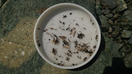 | 天気は、晴れ時々曇り。風は少々。今朝は、夜明け前からすでに冷え込んでいて、遂に午前7時の気温は-3℃。屋外水道や、水たまり・霜などが凍っていました。朝の水辺は、霧で霞んでいて、水温は9℃。午前8時を過ぎて、太陽が照ると、日向になった場所は、みるみるうちに暖かくなっていったのが印象的でした。ハッチは、午前9時頃から現れましたが、ブユの大群ばかりが目立ち、昼間も変わらず。日中は、暖かい陽射しに恵まれると、厚手の上着は必要なくなりましたが、日陰はひんやりと寒く、午後になって陽が翳ると、急に冷えてくることに。今日の最高気温は、昼に11℃。水温は12℃と、共にやや低めで、水辺の昆虫には影響があり、ブユ以外は見られず、しかも昼過ぎには極端に減っていました。一方、魚は意外に活動的で、本日は流心を流れてくるものを捕食していた様子。レインボーは良型~大型が、平瀬では流心の下に。やや深みのある速流では、流心のすぐ脇あたりに着いていて、頭を左右に振るようにしていました。また、ヤマメも積極的で、各所の岩壁沿いの流れに姿を見せていて、水面直下辺りで捕食しているのか?上層付近に着いていたり、巻き返しの中やその周辺に、頻繁に現れるのを確認。空中では、あまり活発な水生昆虫はいませんでしたが、水の中では、(幼虫などが)活動的だったのかもしれません。 |
