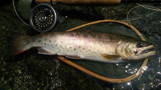 | 天気は晴れて、風はわずか。朝から一日中、快適な陽気。気温は、朝5℃~昼は15℃。水温は10℃~13℃という、格別な暖かさ。今日は、最近の傾向と同じところと、全く異なるところが混在していて、意外に気難しい釣りに。ハッチは、午前中はパラパラと始まり、昼に増えたのはいつも通り。種類は、午前中からカゲロウが多く、昼にはカワゲラ、午後にはガガンボ、など種類が次々に増えたのが特徴的でしたが、少し前には、今日くらいの暖かさでは、陸生昆虫(羽アリや小型のハチなど)が現れていたのですが、さすがに、今日は飛んでいませんでした。また、魚が構える場所や活性の盛り上がり方が異なり、珍しく早い時間から良型レインボーが活動的で、朝(午前9時頃)からドライでの成果をお見受けする。陽が射し込んだ直後で、暖かくなり始めた状況だったにも関わらず、かかった後も、引いて暴れて寄って来ず、長いやりとりを拝見しました。魚の活性の高まり方は、その後も変則的で、都度変化。ハッチに注目している状態では、浮上してパクパクと捕食していたり(大型レインボー)、水面上に流すと静かに追ってきて、ゆっくりと口を開けたり(大イワナ)、ミッジばかりを厳選するかのように飛びついてきたり(年越しヤマメ)・・・と、ドライに好反応を見せ、捕食対象に合わせたミッジドライ(#22~26)で成果と伺う。しかし、全体的な捕食姿勢は控えめで、好天のわりに、ライズが少なかったことや、各所で、流心の中や白泡の下に入ってしまっている状態が多かったのは、意外でした。本日のところは、活性にムラがあり、各所とも、ある瞬間(陽射しが届いている暖かい時のみ等)だけ、活気立っていて、その時以外は、動きが少ないことが多かった様子。そのため成果は、場所と魚(の行動)のタイミング次第というシビアさでした。その一方で、成果の魚は、なぜか、久しぶりに大型(40㎝上)~超大型(50㎝クラス)という極端な結果に。そして、それらは、盛期の頃と同じような力強い引きを見せて、暴走していたのが印象的でした。本日、有効だったのは、朝~昼過ぎはミッジ系。午後(2時頃)は、#16 CDCカディスと伺う。ルアーは、1尾が陣取っているような場所で成果。テンカラは、最下流や上流の流れ込み下など、深場の底付近まで沈めて成果と伺う。 |
