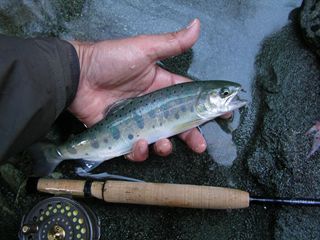 います。本年もどうぞよろしくお願い申し上げます。 今 日の天気は曇りのち晴れ。外気はひんやりしていましたが、太陽が出ている時間は暖かくなりました。魚の活性は高くライズあり。ドライ好調と伺う。特にレイ ンボーは連続の成果。ルアーも良好、ホウライマスの成果も。水量は安定。最下流を除きニーブーツで徒渉可能です。 |