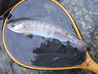 後)はほぼヤマメ。ニンフは立て続けにレインボーの成果続々。またルアーは尺上イワナも。今日の陽気は陽射しはないが過ごしやすい気温で、大型カゲロウ