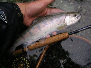 を回ってから。レインボーのライズは水面下から飛び出てきて引っ手繰る勢いとのお声。この時間帯に有効なドライは#16・明るい色だったと伺う。5月に活